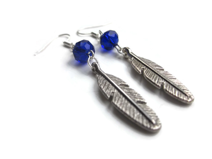 Feather earrings, blue earrings, silver earrings, blue swarovski earrings